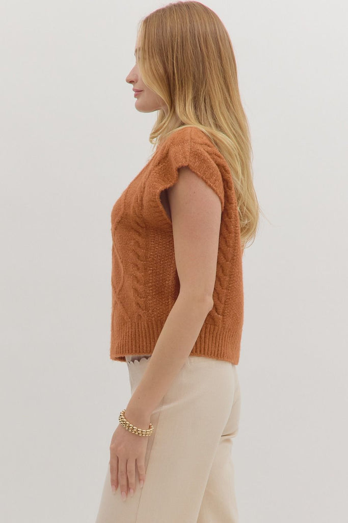 Solid cap sleeve mock neck sweater knit top featuring cable knit pattern.