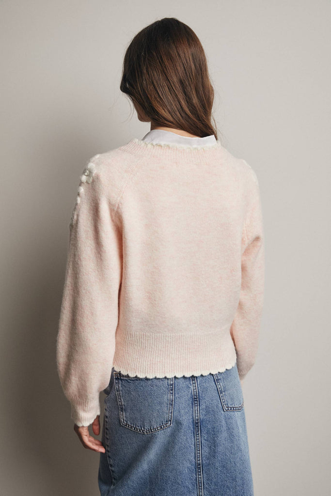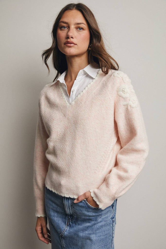- Soft Knit Fabric: Plush knit with a cozy, midweight feel for everyday comfort - V-Neckline: Classic silhouette finished with scalloped trim for a delicate touch - Shoulder Embroidery: 3D floral applique adds texture and feminine detail - Scallop Hem: Subtle scalloped edging at hem and cuffs for a polished finish