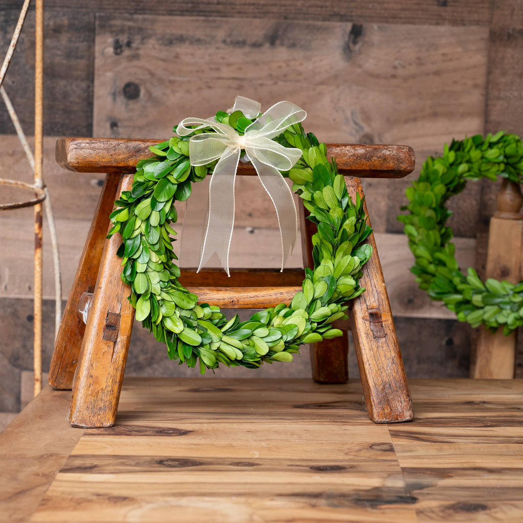 Mills Floral Company - Preserved Boxwood Wreath - Round with Ribbon - 8 Inch