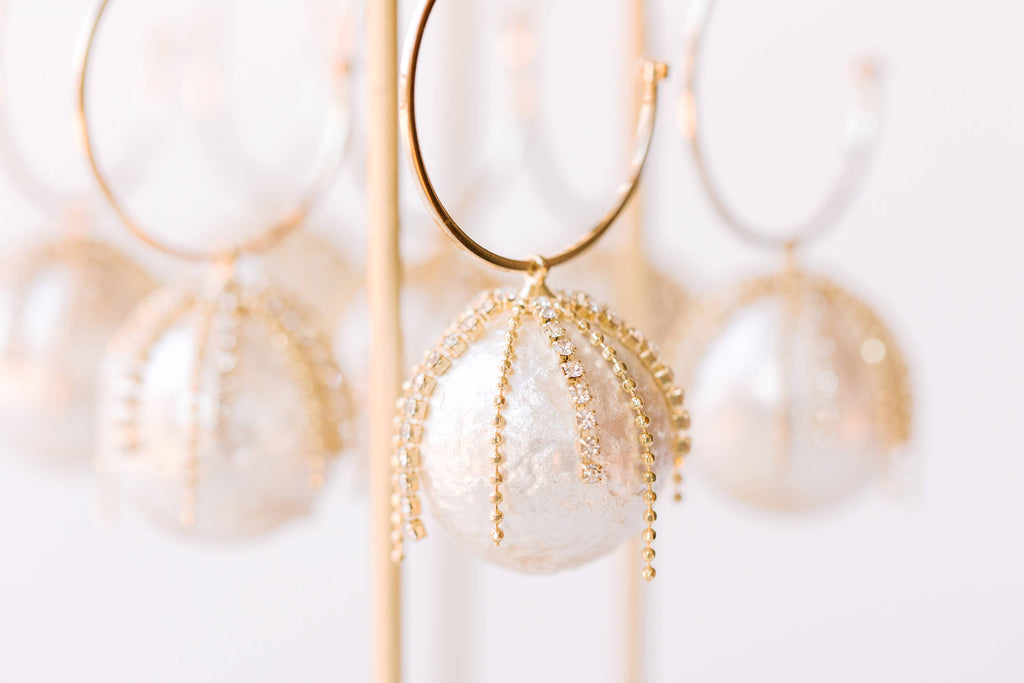 Elevate your holiday jewelry look with these exquisite diamond fringe pearl hoop earrings! Graceful faux diamond tassels cascade over a lustrous pearl making them a must-have for festive gatherings especially New Year's Eve!