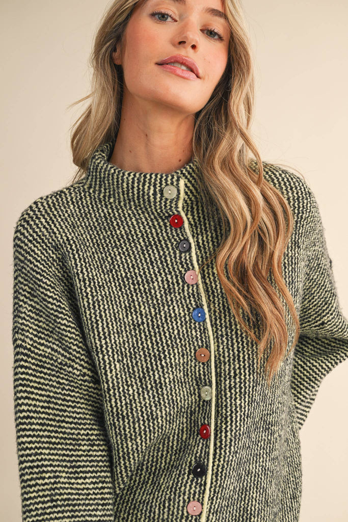 + Striped sweater cardigan with colorful buttons + Stand collar neckline + Button down placket + Colorful buttons + Relaxed fit + Waist length fit + Model is 5' 10.5" 32-24-36 and wears a S