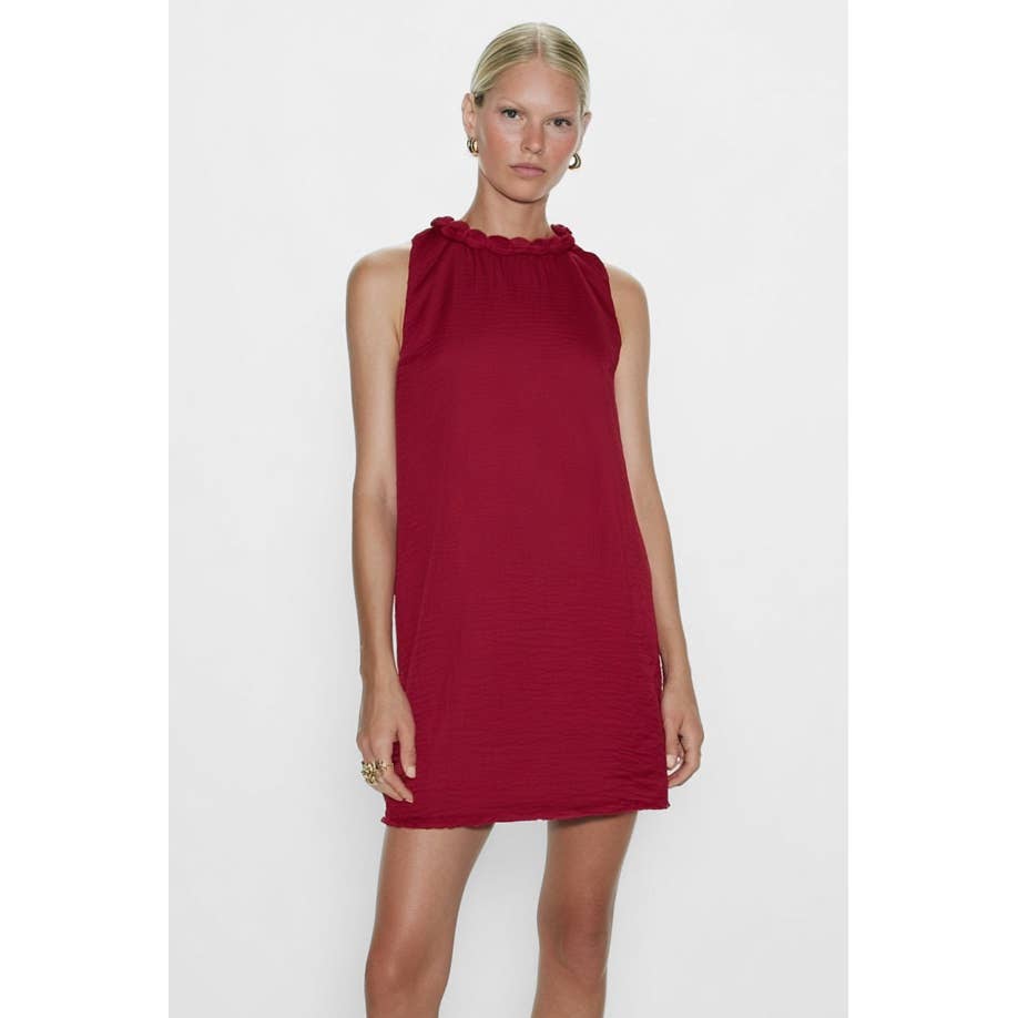 Lightweight silky woven fabric, fully lined for a smooth fit. Ball detail accent along the neckline adds a refined touch. Back zipper closure and slit side pockets for function and ease. Style with heels for a polished evening look or pair with flats for effortless daytime wear. Fabric: Woven 100% Polyester