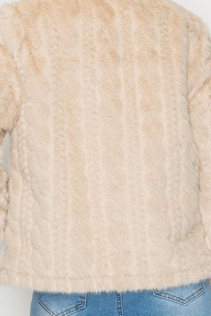 The Joshua jacket. Stylish and elegant. Textured, luxurious, buttery soft faux fur. Braided cable knit detail. Round neck, long sleeves, and side pockets. Front hooks and eyes for closure. Fully lined inside. Beautifully made.
