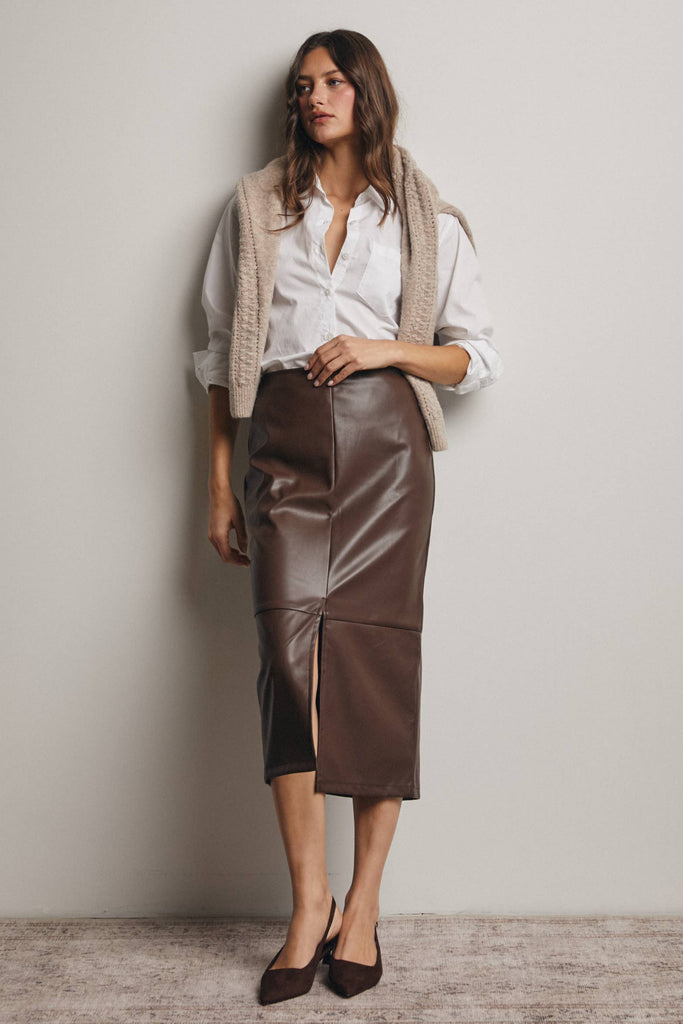 - Smooth Vegan Leather: Made from supple faux leather with a sleek, structured feel - High-Waisted Fit: Sits comfortably at the natural waist for a flattering silhouette