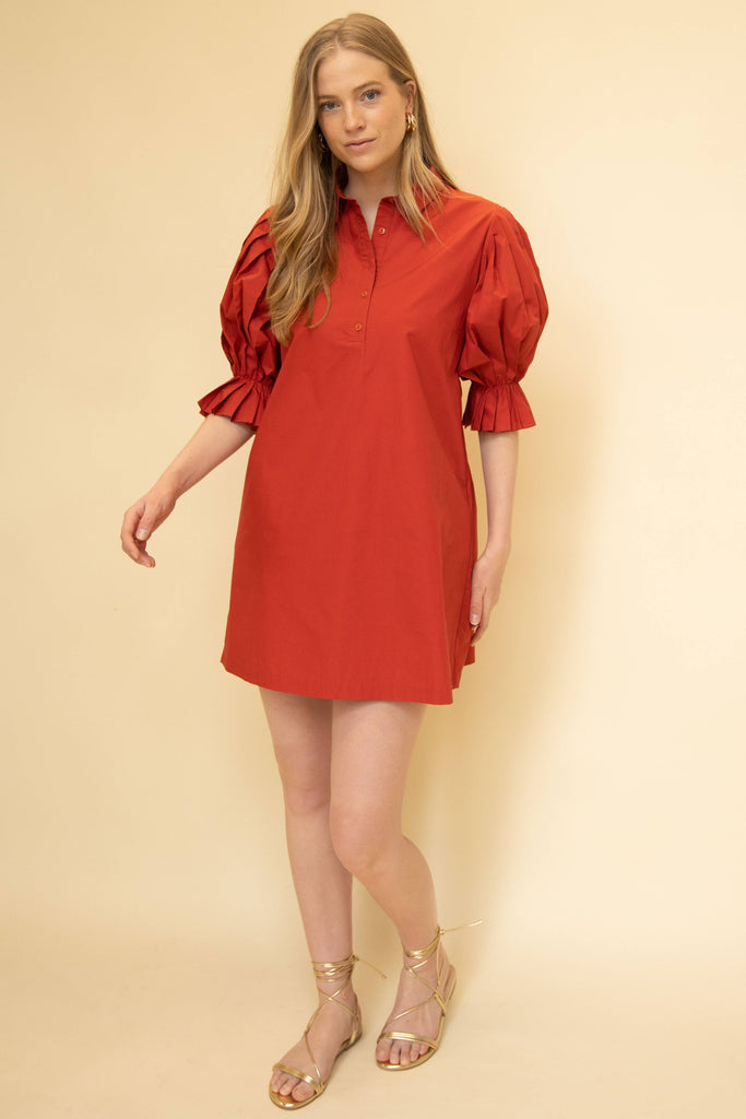 This dress features a tailored shirt collar and a button-down front for a polished look. The standout pleated sleeves add a touch of volume and sophistication, elevating the timeless design.