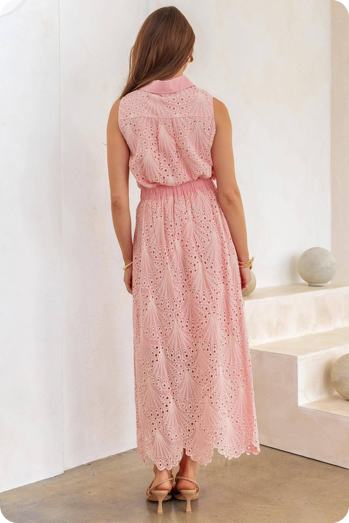Studio Strut and Bolt Collection. Sleeveless shirt and Midi Skirt 2 Piece Set in embroidered eyelet lace fabric. The sleeveless shirt top features button placket closure at front, and spread collar. The midi skirt features beautiful scallop hem, front pleats, banded waist with elastic at back, lining, belt loop, and side pockets.