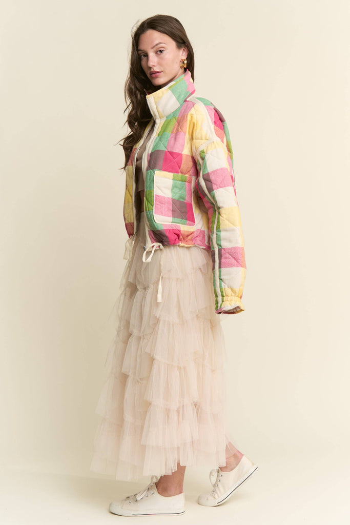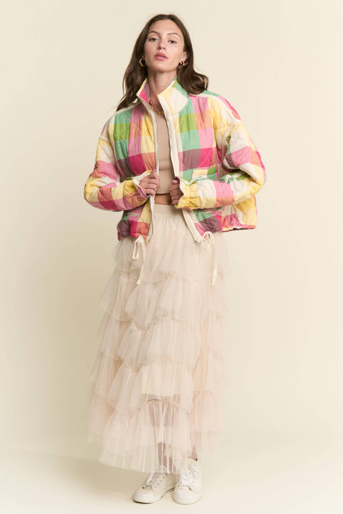 Multi-color plaid zipper puffer jacket. Front pockets.