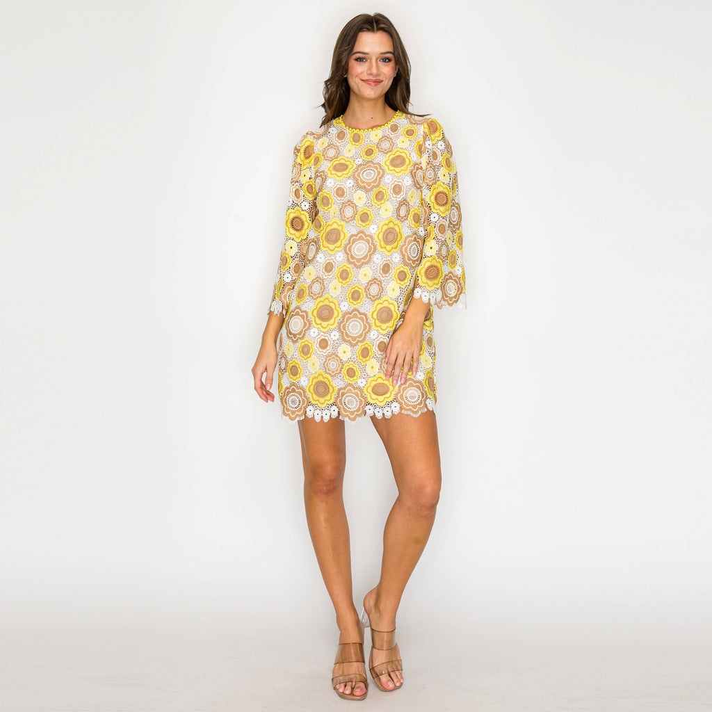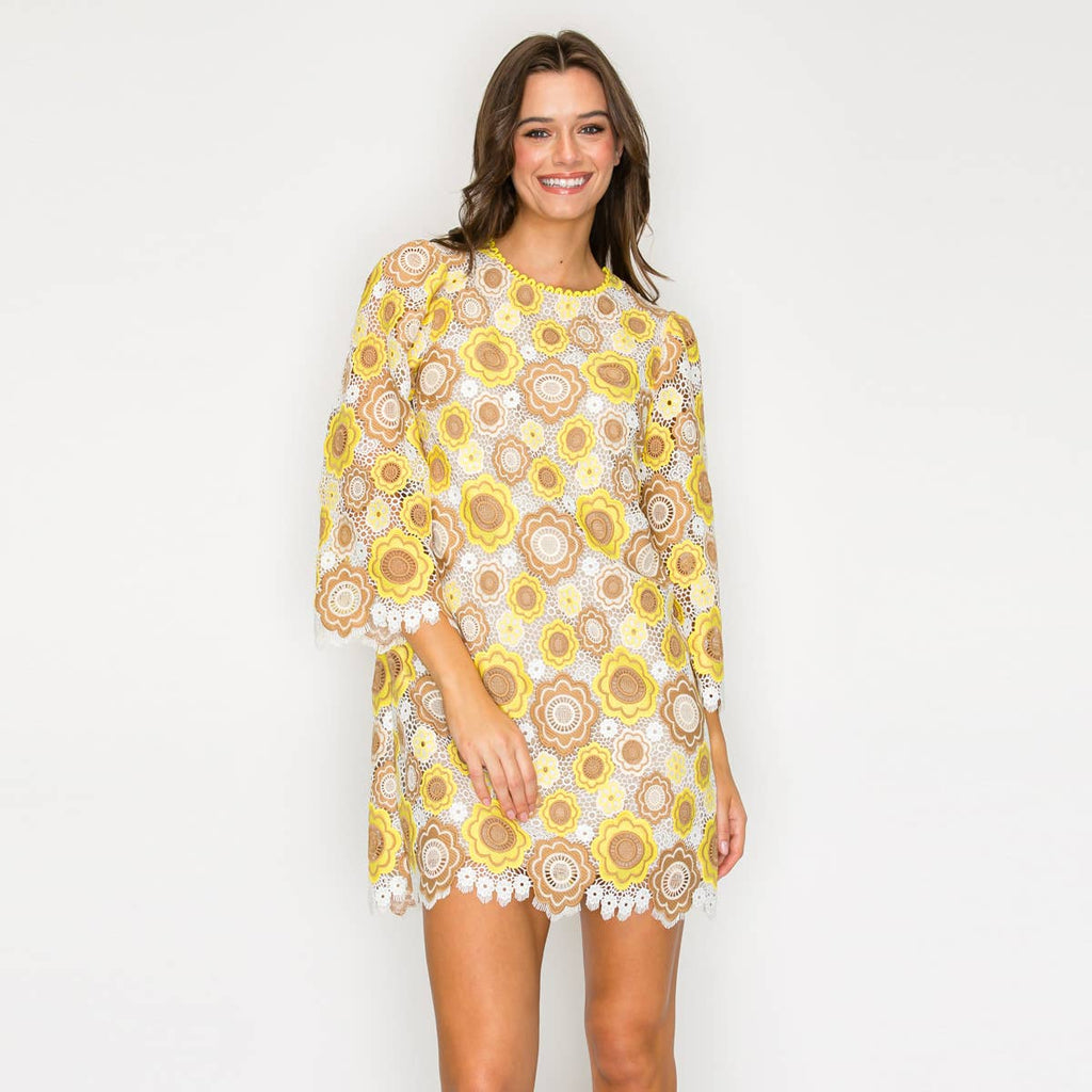This mini dress features a beautifully detailed vintage-inspired lace with a soft marigold floral pattern that feels both nostalgic and elevated. Designed in an easy, relaxed silhouette with scalloped lace edges at the hem and sleeves, it delivers a refined, boutique-worthy look while remaining effortless to wear. Fully lined for comfort, this piece brings timeless charm with a polished, high-end finish. Vintage-inspired lace with intricate floral detailing Scalloped lace hem & sleeve edges for a refined finish Relaxed shift silhouette that flatters effortlessly Fully lined for comfort and coverage.
