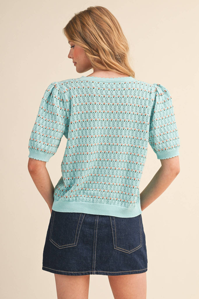 + Pointelle short puff sleeve button down sweater + Ribbed scalloped round neckline + Ribbed scalloped button down placket + Short puff sleeves with ribbed scalloped cuffs + Pointelle knit + Ribbed hem
