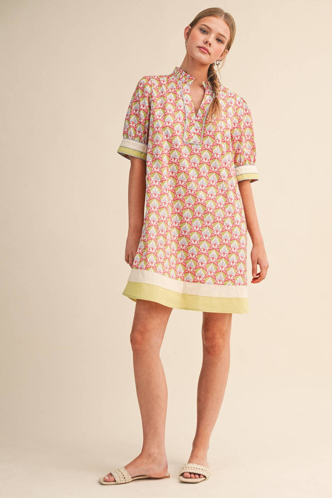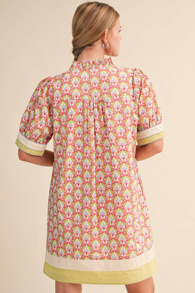 + Vintage floral puff sleeve mini dress + Pleated ruffled V neckline + Contrast piping detail on neckline + Short puff sleeves with gathered shoulders + Contrast cuffs with piping detail + Pockets + Lined + Contrast mini hem