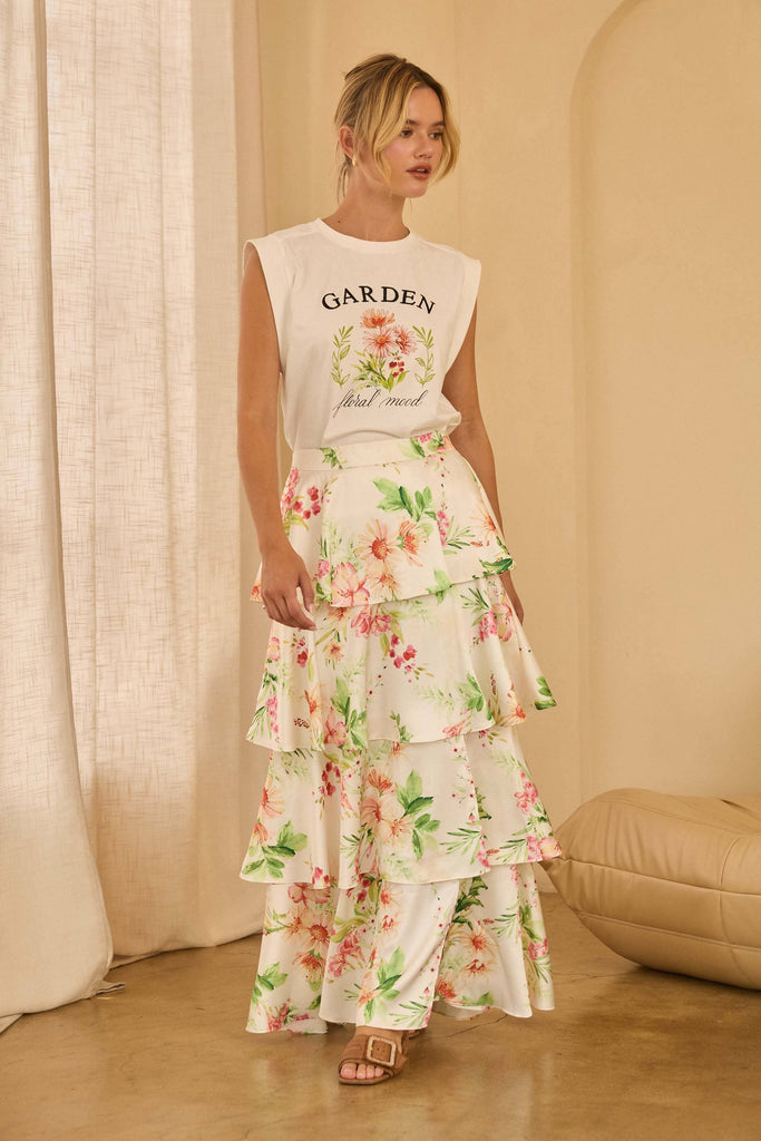 A romantic statement piece for any season, this floral print tiered maxi skirt features flowing layers that create beautiful movement with every step. Designed with a flattering high-rise waist, it elongates the silhouette while offering effortless comfort. The tiered construction adds volume and dimension, and the soft, lightweight fabric drapes gracefully for an airy, feminine finish. Perfect for brunch dates, weekend getaways, or elevated everyday styling, this maxi skirt pairs seamlessly with fitted tops, knits, or simple tees for a chic and versatile look.