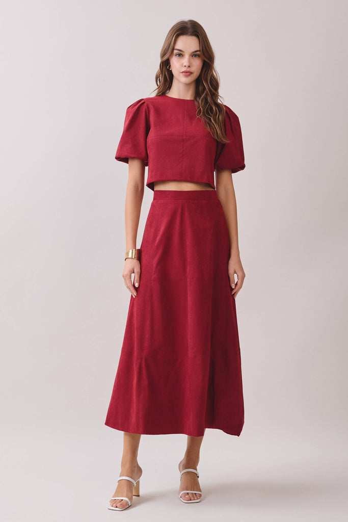 An A-line midi skirt featuring with a clean waistband, subtle panel seams, and a back concealed zipper closure.